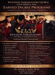 Kingdom Ambassadors Global University, Inc. was established in 2003 by Dr. Arleen A. Fuller.  In 2020, this school was incorporated in the State of GA as a non-profit online Christian University to offer degrees to clergy and Christian leaders at an affordable price and an accelerated pace. This school is a school of excellence, integrity, and honesty.